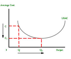 معنای ساده اقتصاد مقیاس ، انجام کارها با کارآیی بیشتر و افزایش اندازه است. عوامل موثر در صرفه به مقیاس، خرید (خرید عمده مواد از طریق قراردادهای بلند مدت) ، مدیریت (افزایش تخصص مدیران و کارمندان) ، مالی (اخذ وام های بانکی با بهره کم و دسترسی به ابزارهای مالی بیشتر ) ، بازاریابی (سرشکن کردن هزینه ی تبلیغات در طیف وسیعی از تولید در بازارهای رسانه ای) و فناوری (بهره گیری از بازگشت به مقیاس در عملکرد تولید). هر یک از این عوامل با تغییر منحنی متوسط هزینه کل کوتاه مدت (SRATC) به سمت پایین و راست ، متوسط هزینه های بلند مدت (LRAC) تولید را کاهش می دهد.