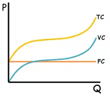 هزینه کل: مجموع هزینه های متغیر و هزینه های ثابت معادل کل هزینه ها است. بر روی نمودار ، منحنی TC و VC مانند هم اند با این تفاوت که منحنی TC به اندازه ی هزینه های ثابت از VC بالاتر است.