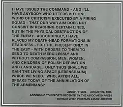 «امروز دیگر چه کسی…؟ با تاسف باید یادآور شد که نسلکشی ارمنیها، که اولین قتلعام قرن بیستم شد، آخرین آن نبود، کشتارهای بزرگ و کوچک دیگری به دنبال آن آمدند و همچنان میآیند که سازمان ملل و سازمانهای بینالمللی دیگر هنوز توانایی مجازات یا پیشگیری از وقوع آنها را در خود نیافتهاند.»