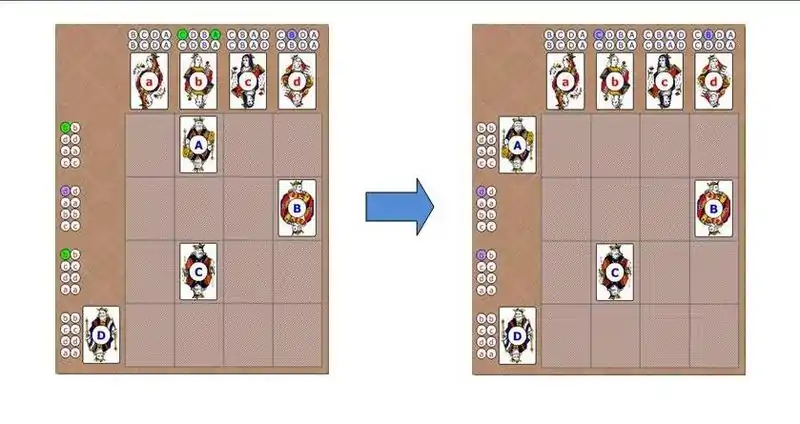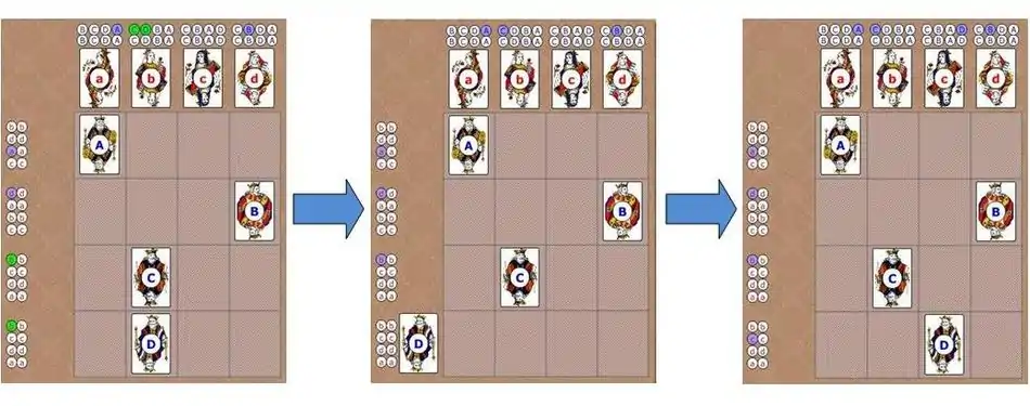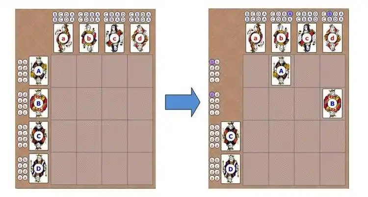 در شکل روبه رو: ۴ مرد (شاه) و ۴ زن (ملکه) وجود دارند. برای مثال مرد A زنها را با ترتیب C , A، D , B امتیاز دهی کردهاست و به همان صورت زن B مردها را با ترتیب A , B، D , C ترجیح میدهد.