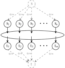 برای پیدا کردن تطابق بیشینه (تطابقی که بیشترین تعداد رأسهای ممکن را دارد) در یک گراف دو بخشی ، میتوانیم مسئله را با ساختن شبکهٔ به یک مسئلهٔ بیشینه جریان تبدیل کنیم، که: