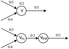 به بیان دیگر مقدار جریانی که از یک رأس میگذرد نمیتواند از ظرفیت آن بیشتر باشد. برای یافتن ماکسیمم جریان در میتوان با گسترش ، مسئله را به یک مسئلهٔ بیشینه جریان تبدیل کرد. ابتدا هر با و جایگزین میشود که متصل به یالهایی است که به وارد میشود و متصل به یالهایی است که از آن خارج میشوند، سپس ظرفیت را به یالی نسبت میدهیم که و را شامل میشود (شکل ۴٫۴٫۱ را ببینید، ولی در نظر داشته باشید که جای و به اشتباه در آن جابهجا شدهاست). در این شبکهٔ گسترش یافته، شرط ظرفیت رأس برداشته شده است؛ بنابراین میتوان با این مسئله مانند یک مسئلهٔ بیشینه جریان برخورد کرد.