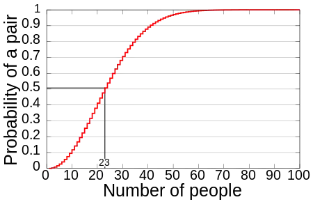 این مسئله نیز میتواند به وسیله فرمول زیر برای تعداد نفراتی که حضورشان برای داشتن حداقل ۵۰٪ شانس برای تطبیق ضروری است تخمین زده شود: