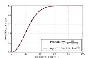 که همانگونه که نمودار نشان میدهد، تقریباً صحیح است. درک این مطلب ساده است که یک روش مشابه برای هر تعداد از "نفرات" و "روزهاً میتواند به کار رود. اگر به جای ۳۶۵ روز، n روز را در نظر بگیریم و m نفر وجود داشته باشند و m ≤ n باشد، آنگاه با استفاده از روش بالا به این نتیجه میرسیم که اگر Pr[(n, m)] احتمال حضور حداقل دو نفر خارج از m نفر که از میان یک مجموعه n روزه تاریخ تولد یکسان دارند باشد، آنگاه: