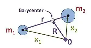 که بردار مکان مرکز جرم سامانه دو جرم بوده و از رابطهٔ زیر بدست میآید: