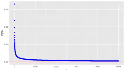 - که وقتی n به بینهایت میل کند این احتمال به صورت نزولی اکید به ۱/۲ میل میکند.