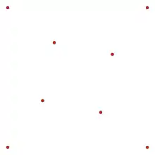 - f(۵) = ۹.[3] مجموعهای از هشت نقطه که پنج ضلعی محدب ندارند در شکل نشان داده شدهاست، که نشان میدهد f(5)> ۸ است. قسمت دشوارتر اثبات این است که نشان دهیم هر مجموعه از ۹ نقطه در وضعیت معمولی دارای رئوس یک پنجضلعی محدب است.