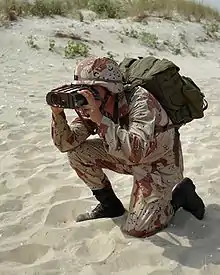 یک تیرانداز ماهر هلندی در حال استفاده از دوربینهای دو چشمی فاصله سنج لیزری و تفنگ مگنام فاصله سنجها یک فاصله دقیق را برای اهدافی که دورتر از فاصلهٔ شلیک مستقیم هستند برای تیراندازها و توپخانهها فراهم میکنند. آنها همچنین میتوانند برای تلفیق و مهندسی نظامی هم استفاده شوند.