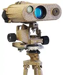 پرونده:یک فاصله سنج برد بالا که قادر به اندازهگیری فاصله ۲۰ کیلومتر است و روی یک سه پایه با پایه سه گوش سوار شدهاست. این دستگاه حرکات قوسی و بالا و پایین را نیز پشتیبانی میکند.