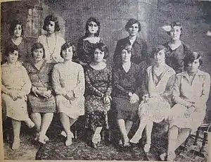 نشسته از چپ به راست: فخرآفاق پارسا، ملوک اسکندری، کبری چنانی، مستوره افشار، نصرت مشیری، صفیه اسکندری، عصمتالملوک شریفی - ایستاده: مهرانگیز اسکندری، بانو چنانی، هایده افشار، عباسه پایور، قدیسه مشیری[1]