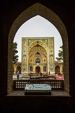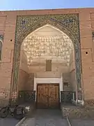 این مسجد دارای چهار در بزرگ ورودی از شمال، جنوب، شرق و شمال غربی است. در شمال غربی به دالان درازی باز میشود که در انتهای آن تکیه پهنهاست. درهای شمال، جنوب و شرق دارای هشتی دالان و دهلیز هستند. بالای درهای شمالی و شرقی تزئینات مقرنس کاری گچی زیبا با دو گوشواره دو طبقه در طرفین با پشت بغلهای کاشی کاری شده وجود دارد. در هشتیهای شمالی، جنوبی و شرقی تاقهای آجری گنبددار با تاقنماهای متعدد با لچکی کاشی کاری شده مشاهده میشوند.