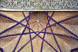 در زیرطاق اصلی کاربندی زیبایی با آجرهای نقاشی شده بکار رفته و در دو طرف ایوان دومناره قرار گرفته که از سطح حیاط تا بالا بوسیله کاشیهای رنگی (لاجوردی،فیروزه ای،مشکی وسفید)تزیین شدهاند.