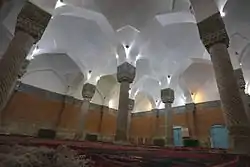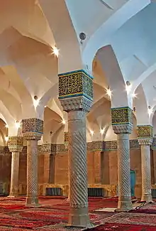 این مسجد دارای بیست و چهار ستون سنگی است که بهطور استادانه پایه، بدنه و سرستونهای آن حجاری شده و از این حیث با مسجد وکیل شیراز قابل مقایسه است. بر روی تمام پایهها یک طرح به صورت گلهای برجسته حجاری شدهاست.