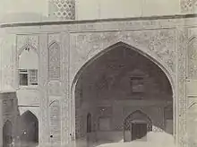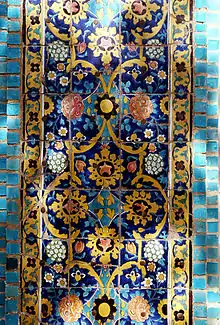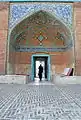 کاشیهایی با لعاب چند رنگ که به هنگام ساخت بنا در تمامی آن به کار رفتهاست. بخشی از این کاشیها که مستقیماً در معرض جریانات جوی قرار داشته، کمکم فروریختهاند، و کاشیهایی که کمتر در معرض عوامل طبیعی قرار داشتهاند، تاکنون سالم ماندهاست. طرحهای تزئینی گل و گیاه تشکیل شدهاست که به صورتهای اسلیمی در درون و اطراف ترنج و نیمترنجهایی که به عنوان طرح مرکزی محسوب میشوند ظاهر گردیدهاند. کاشیهای «معقلی» که در زمانهای بعد و به هنگام مرمت جای کاشیهای «با لعاب چند رنگ» را گرفتهاند و از عناصر هندسی که به صورت ستارههای هشتپر یا گلهای هندسی در نما تشکیل شدهاست. بیشترین سهم را در تزیین بنا کاشیهای چند رنگ به خود اختصاص دادهاند. بهعلاوه از کاشیهای معرق در تزیین گلدستههای دوگانه بنا که پیوسته در معرض خطرات ناشی از عوارض طبیعی قرار دارند، استفاده گردیده تا در مواقع لزوم بهراحتی بتوان نسبت به تعویض اجزای آن اقدام نمود.