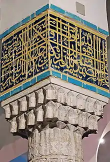 خطوط ثلث و نستعلیق را نیز که با رنگ سفید به روی کاشیها نوشته شده میتوان ازجمله عناصر تزئینی مهم بنا محسوب نمود.