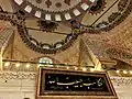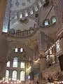 دور تا دور صحن مسجد در پایینترین قسمت توسط ۲۰۰۰۰ کاشی سرامیک دستساز تزیین شدهاست که این سرامیکها در ازنیک (نیشای باستان) ساخته شدهاند. بخش بالایی نقاشی شدهاست. بیش از ۲۰۰ پنجره شیشهای نور را به درون صحن اصلی هدایت میکنند و از لوسترهای بزرگ نیز برای نورپردازی مسجد کمک گرفته شدهاست. در دکوراسیون از آیاتی از قرآن استفاده شدهاست که بسیاری از آنها به خط سید کاظم غباری نوشتهاند که بزرگترین خطاط آن زمان بودهاست. صحن اصلی فرش شدهاست و این فرشها در زمان مقتضی تعویض میشوند.