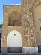 تاق ورودی سردر، مقرنسکاری است و ترنجی برجسته در قسمت پایین تاق قرار دارد. گچبری طرح گره اطراف تاق را آراسته کردهاست. سردر ورودی و اصلی مسجد، شمالی است؛ در قدیمی مسجد از جنس چوب و کم ارتفاع است. در گذشته برای این که افراد هنگام ورود به مسجد سری به نشانه تعظیم خم کنند و سپس وارد شوند، درهای ورودی را کم ارتفاع درست میکردند. همین که از سردر شمالی داخل شدیم، وارد راهرویی با سقف نسبتاً بلندی میشویم که آجرکاری معقل نمای آن را شکل داده است.[2][3]