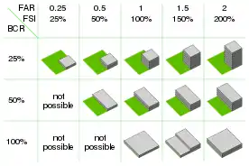 مساحتی که میتوان بنا را بر روی آن ساخت بر اساس دو موضوع تعیین میشود: نسبت پوشش ساختمان (建蔽率 kenpeiritsu) و نسبت سطح کف (容積率 yōsekiritsu). نسبت پوشش ساختمان نسبت مساحت بنا به مساحت کل زمین است. این دو رقم اغلب در تبلیغات قطعه زمین ذکر میشود، برای مثال ۷۰:۴۰۰[13] (که در آن ۷۰ به این معناست که نسبت پوشش ساختمان ۷۰٪ و نسبت مساحت زمین ۴۰۰٪ است). این بدان معناست که برای ساخت یک ساختمان ۴ طبقه فقط از ۷۰٪ زمین میتوان استفاده کرد. در نتیجه برای نسبت پوشش ماکزیمم ۵۰٪، بزرگترین بنایی که در یک زمین ۱۰۰ متر مربعی میتوان ساخت فقط ۵۰ متر مربع خواهد بود. به علاوه، برای جلوگیری از انسداد بیش از حد نور در ملک همسایه، ممکن است تعداد طبقات در یک ساختمان محدود شود.