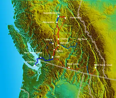 مسیرهای پیادهروی و جادهها و آب راهها در استعمار بریتانیا در بریتیش کلمبیا. خط چینها مسیر دِوِدنی در سراسر جنوب از مستعمره نشان میدهد.