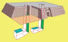 نمای بیرونی ساختمان مثلثگونه ساخته میشود و دیوارهای شیبدار به سقف صافی میرسند که طول آن نزدیک چهار برابر عرضش است. ارتفاع ساختمان نزدیک ۹ متر میشود. مصطبهها در جهت شمال-جنوب بنا میشدند و درون بخش بالایی آنها اتاقی صومعهوار وجود داشت تا کاهنان و خانوده فرد درگذشته بتوانند غذا و دیگر نیازهای روان مرده را درون آن بگذارند. اتاق پنهان دومی که «سرداب» خوانده میشود، تندیسی از مرده را در میان سنگها به منظور مراقبت از آن پنهان میکرد.[3] در بالای این اتفاق دریچههای کوچکی وجود داشتند که نه برای دیدن تندیس از بالا بلکه برای رسیدن دود و بخار و صدای دعاهای خوانده شده برای تندیس ساخته شده بودند.[4]