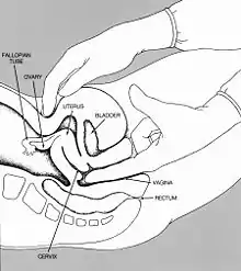 از آنجا که رحم و تخمدان خارج از بدن دیده نمیشود، پزشک برای این بخش از معاینه باید داخل شکم و لگن را با دست لمس کند. پزشک با انگشتان یک دست که با مواد روانکننده آغشته شدهاست، داخل واژن را لمس میکند، در حالی که دست دیگر به آرامی روی قسمت بیرونی شکم فشار میآورد.[3]