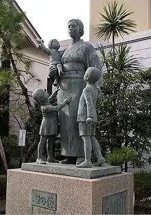 مجسمه یک مادر بیوه در معبد یاسوکونی که به تنهایی فرزندان خود را بزرگ میکند