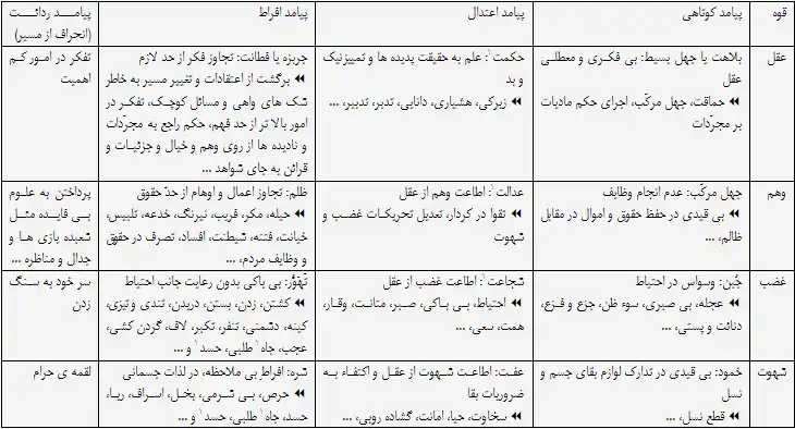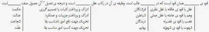 صفاتی که در اثر کوتاهی یا اعتدال ویا افراط ویا ردائت روح در اطاعت از هر یک از قوا حاصل میشود و صفاتی که حصول آنها به این صفت بستگی دارد، از این قرار اند: