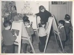 ![]() کودکان در کودکستان مهر در دوره زمانی ۱۳۳۲-۱۳۳۴ آموزش نقاشی روی بوم | |