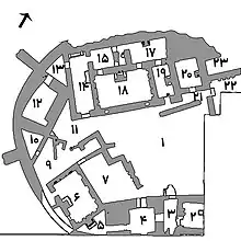 - منطقه شرقی (بلندترین قسمت با ۱۸ متر ارتفاع) که ناحیهٔ مسکونی بود؛