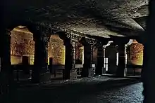 دوره حکومت سلسله ماوری، شاهد پیدایش مقدمات یک سبک بینظیر معماری (پرستشگاههایی که در دل صخرههای سنگی کنده میشدند بود. بخشهایی از درون و بیرون این غارها را با تقلید مو به مو از ابنیه چوبی آن دوره، کنده کاری کردند.[11] محل خلوت و تن آسایی و آرامش رهروان زنده دل بودایی بود که در سنگهای کوه بنا میگردید. غالباً سردر آن نعلی شکل بود و با ستونها، دیوارهای سنگی و رواقهای خوش نقش تزئین میشد و داخل غار را ستونهای مزین و سر ستونهای جانوران به حالت نقش برجسته تشکیل میداد. درون معبد تالاری برای اجتماع بود و در انتهای آن محرابی که بقایای اجساد مردگان مقدس در آن قرار میگرفت و در طول تالار دو ردیف ستون شبستان را از راهروهای کناری جدا میکرد.[12]