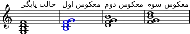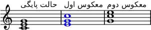 مثال: به ترتیب آکورد دو ماژور به حالت پایگی، معکوس اول (نت پایه به یک اکتاو بالاتر منتقل شدهاست) و معکوس دوم (پنجم آکورد در بخش باس قرار گرفتهاست).