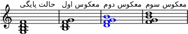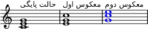 مثال: به ترتیب آکورد دو ماژور به حالت پایگی، معکوس اول (نت پایه به یک اکتاو بالاتر منتقل شدهاست) و معکوس دوم (پنجم آکورد در بخش باس قرار گرفتهاست و فواصل چهارم و ششم در بالای آن قرار دارد).