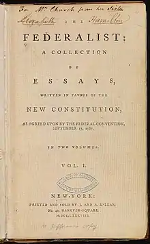 ![]() تیتر اولین مقاله فدرالیست (1788). This particular volume was a gift from الکساندر همیلتون's wife Elizabeth Schuyler Hamilton to her sister Angelica | |