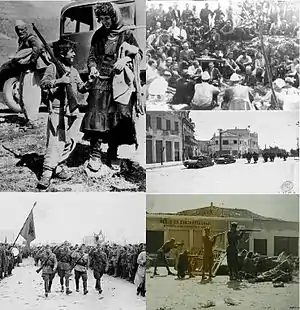 ![]() ساعتگرد از بالا سمت چپ: ۱. پناهجویان آلبانیایی در حال گذر از مرز پادشاهی یوگسلاوی در ۱۲ آوریل ۱۹۳۹ میلادی، ۲. بالیستها و کمونیستها در حال گفتگو در خلال توافق موکیه در سال ۱۹۴۳ میلادی، ۳. حمله ایتالیا به آلبانی، ۴. پارتیزانهای کمونیست در حال جنگ در تیرانا در سال ۱۹۴۴ میلادی، ۵. پس از آزادسازی آلبانی در ۲۸ نوامبر ۱۹۴۴ پارتیزانها در حال راهپیمایی. | |||||||