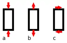 - بارگذاری عرضی: نیروهایی که عمود بر محور طولی عضو اعمال میشود. بارگذاری عرضی موجب خمش و انحراف عضو از موقعیت اصلی خود با کشش داخلی و کرنشهای فشاری به همراه تغییر در انحنای عضو میشود. بارگذاری عرضی نیز حاوی نیروهای برشی که باعث تغییر شکل برشی ماده و افزایش انحراف عرضی عضو است نیز میباشد.