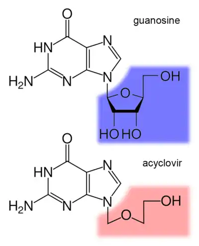 از اواسط دههٔ ۱۹۸۰، توسعه داروهای ضد ویروسی به سرعت افزایش یافتهاست که دلیل عمده این تلاشها، همهگیری بیماری ایدز است. داروهای ضد ویروسی اغلب یک نوع آنالوگ نوکلئوزید هستند؛ مولکول این داروها همخانوادهٔ مولکول دیانای است اما ساختارش با بلوکهای ساختمانی دیانای یکسان نیست. هنگامی که تکثیر دیانای ویروس شروع میشود، برخی از این بلوکهای ساختگی جعلی در ژنوم ویروس گنجانیده میشوند. به محض این که این اتفاق میافتد، تکثیر ژن ویروس متوقف میشود و چون بلوکهای ساختگی جعلی فاقد ویژگیهای اساسی هستند که امکان افزودن بلوکهای بیشتر را فراهم میکند، ویروس دیگر نمیتواند تولید مثل کند.[64] نمونههایی از آنالوگهای نوکلئوزید عبارتند از: آسیکلوویر برای عفونت ویروس هرپس و لامیوودین برای عفونت ویروس ایدز و هپاتیت بی. آسیکلوویر یکی از قدیمیترین و رایجترین داروهای ضد ویروسی است.[65]