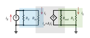 شکل ۳ یک مثال تقویت کننده جریان را نشان میدهد. تقویت کننده (جعبه خاکستری) مقاومت ورودی و مقاومت خروجی و بهره جریان ایدهآل را دارد . با یک محرک جریان ایدهآل (مقاومت بینهایت نورتون)، همه منابع جریان به جریان ورودی برای تقویت کننده تبدیل میشوند. با این حال، برای یک محرک نورتون مقسم جریان در ورودی تشکیل شده که جریان ورودی را به فرم زیرکاهش می دهد