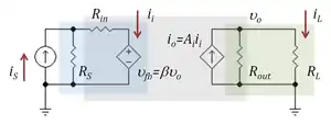 بدین معنی که، بهره جریان ایدهآل نه تنها به وسیله عوامل بارگیریی، بلکه به دلیل ماهیت دو جانبه دو پورته با عامل دیگر (1 + β (R L / R S) Loaded)، که نمونه ای از مدارهای تقویت کننده بازخورد منفی است، کاهش میابد. عامل β (R L / R S) بازخورد جاری است که توسط بازخورد منبع ولتاژ بهره ولتاژ β V / V ارائه شدهاست. به عنوان مثال، برای یک منبع ایدهآل با R S = ∞ Ω، بازخورد ولتاژ هیچ تأثیری ندارد و برای R L = ۰ Ω، ولتاژ بار صفر وجود دارد، و دوباره بازخورد را غیرفعال میکند.