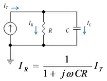 شکل 2 یک مقسم جریان ساده را که از یک خازن و یک مقاومت تشکیل شدهاست رانشان میدهد. با استفاده از فرمول زیر، جریان در مقاومت توسط زیر داده شدهاست :