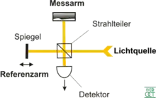 در ابن رابطه نسبت پخشکنندگی نور در اینترفرومتر بوده و درجهٔ مختلط همگرایی است.[4] بخش نشان دهندهٔ این است که توان منتقل شده به آشکارساز به شدت وابسته به تأخیر زمانی (اختلاف فاز) دو موج رسیده به آشکارساز است. بهطوریکه تا دو برابر میتواند توان بیشتری به آشکارساز منتقل کند. ایدهٔ اصلی روش تصویربرداری OCT نیز از همینجا ناشی شدهاست.