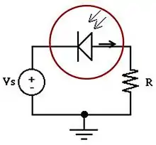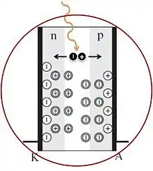 در هر فوتودیتکتور، یک فوتون نوری به جریان (یا ولتاژ) تبدیل میشود. دو شکل روبرو یک فوتودیتکتور (که به صورت معکوس بایاس شدهاست) و پیوند p-n آن را نمایش میدهند. در مدار شکل رسم شده جریان اندکی به صورت معکوس در مدار برقرار است. حال فرض کنید یک سیگنال الکترومغناطیسی که ناشی از جمع دو موج نوری است و قبلاً توان آن را محاسبه کردیم به این فوتودیتکتور برسد. با رسیدن فوتون این سیگنال به فوتودیود مشخص شده با دایرهٔ قرمز، یک جفت الکترون-حفره درون پیوند p-n این دیود ایجاد میشود. به این ترتیب حفرهٔ ایجاد شده به سمت راست (سمت p) و الکترون ایجاد شده به سمت چپ (سمت n) حرکت میکنند. با این اوصاف جریان معکوس مدار افزایش یافته و در نتیجه یک فوتون نوری به یک سیگنال الکتریکی تبدیل میشود.