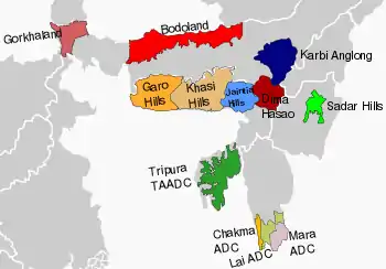 شوراهای مناطق خودمختار که تحت برنامه ششم قانون اساسی هند فعالیت میکنند به صورت پررنگ نشان داده شدهاند.
