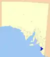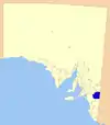 | Tatiara District Council | بوردرتاون، استرالیای جنوبی | Southeast | 1876 | ۶٬۴۷۶ | ۲٬۵۰۰ | ۲٬۵۰۰ | 2,500 | ۶٬۶۶۰ | [[:en:File:Tiatara_LGA.png| ]] | |