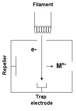 که در آن M اتم یا مولکول یونیزه شدهاست، الکترون است، و یون حاصل است.