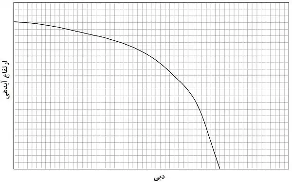 در این شکل محور عمودی ارتفاع آبدهی (فشار به وجود آمده در خروجی پمپ) و محور افقی دبی پمپ را نشان میدهد.
