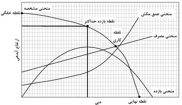 - نقطه نهایی پمپ: مقدار دبی در این نقطه بیشترین مقدار است زیرا پمپ حداکثر میزان توان را مصرف میکند و پمپ با سر و صدا و ارتعاش زیاد کار میکند.