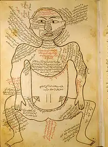 برگی از کتاب تشریح منصوری که در آن کالبدشناسی عضلات بدن انسان را شرح داده است. این کتاب در کتابخانهٔ ملی آمریکا نگهداری میشود