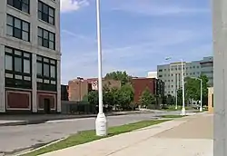 ![]() Garfield Street, looking east from Woodward. The building to the left is the Garfield Building; the John Dingell Detroit Veterans' Administration Hospital is in the background, and the Garfield Manor Apartments in the center. | |