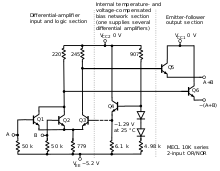مقدار ولتاژ تغذیه طوری انتخاب میشود که جریان کافی از میان دیودهای جبرانکننده D1 و D2 عبور کند و افت ولتاژ در سرتاسر مقاومت امیتری عادی یا معمولی RE کافی است. مدارهای ECL موجود در بازار آزاد که معمولاً با سطوح منطق کار میکنند با دیگر خانوادهها سازگاری ندارند. این بدان معنی است که عملیات بین ECL و سایر خانواده مدارهای منطقی مانند خانواده معروف TTL به مدارهای میانجی اضافی احتیاج دارند. این حقیقت که سطوح منطق پایین و بالا نسبتاً نزدیک هم هستند بدین معنی است که ECL از سر و صداهای جزئی برخوردار است که این موضوع خود یک مشکل محسوب میشود.