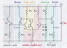 ECL بر مبنای زوج امیتری است که در این شکل در سمت چپ با رنگ قرمز هاشور خوردهاست. نیمه سمت چپ این زوج (که با رنگ زرد هاشور خورده) شامل دو ترانزیستور ورودی موازی T1 و T2 (گیت نمونه با دو ورودی) است که منطق T3 با یک منبع ولتاژ مرجع محکم شدهاست که با رنگ سبز کم رنگ هاشور خوردهاست: مقسم ولتاژ با جبران گرمایی (یودی R1 و R2 و D1 و D2) و بعضی وقتها امیتری پیرو میانگر (که در تصویر نشان داده شدهاست) در نتیجه، ولتاژهای امیتری نسبتاً ثابت هستند؛ بنابراین، مقاومت امیتری عادی RE تقریباً مانند منبع جریان عمل میکند. ولتاژهای خروجی در مقاومتهای بار کلکتور RC1 و Rc3 به وسیلهٔ امیتری پیروهای T4 و T5 (که با رنگ آبی هاشور خوردهاند) به خروجیهای معکوسکننده یا وارونگر و غیر وارونگر تغییر میکنند. مقاومتهای امیتری خروجی RE4 و RE5 در همه مدلهای ECL بکار نرفتهاست. در بعضی موارد مقاومتهای خروجی خط ۵۰ اهمی بین بیسهای ترانزیستورهای ورودی متصل شده و ۲- ولت به عنوان مقاومت امیتری عمل میکند.